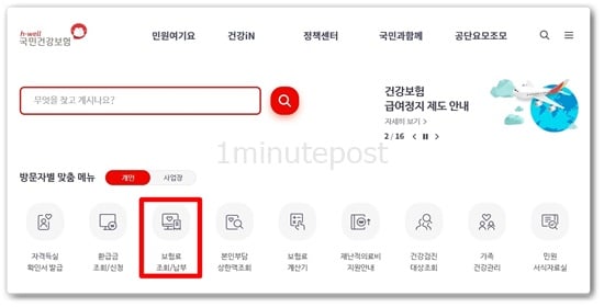 로그인이 완료되면 메인화면으로 돌아가며, 맞춤 메뉴에서 ‘보험료 조회/납부’를 클릭합니다.