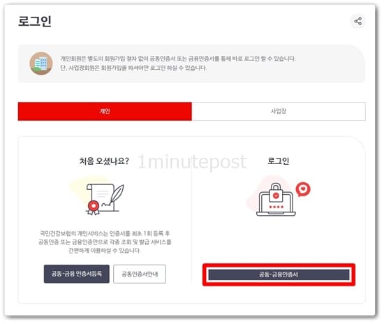 홈페이지 접속 후 공동 또는 금융인증서로 로그인을 합니다. 처음 이용하는 경우 인증서등록을 한 후 진행가능합니다.
