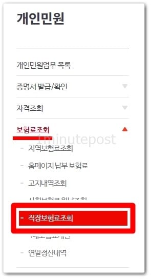 개인민원 중 보험료조회에서 ‘직장보험료조회’를 클릭합니다.