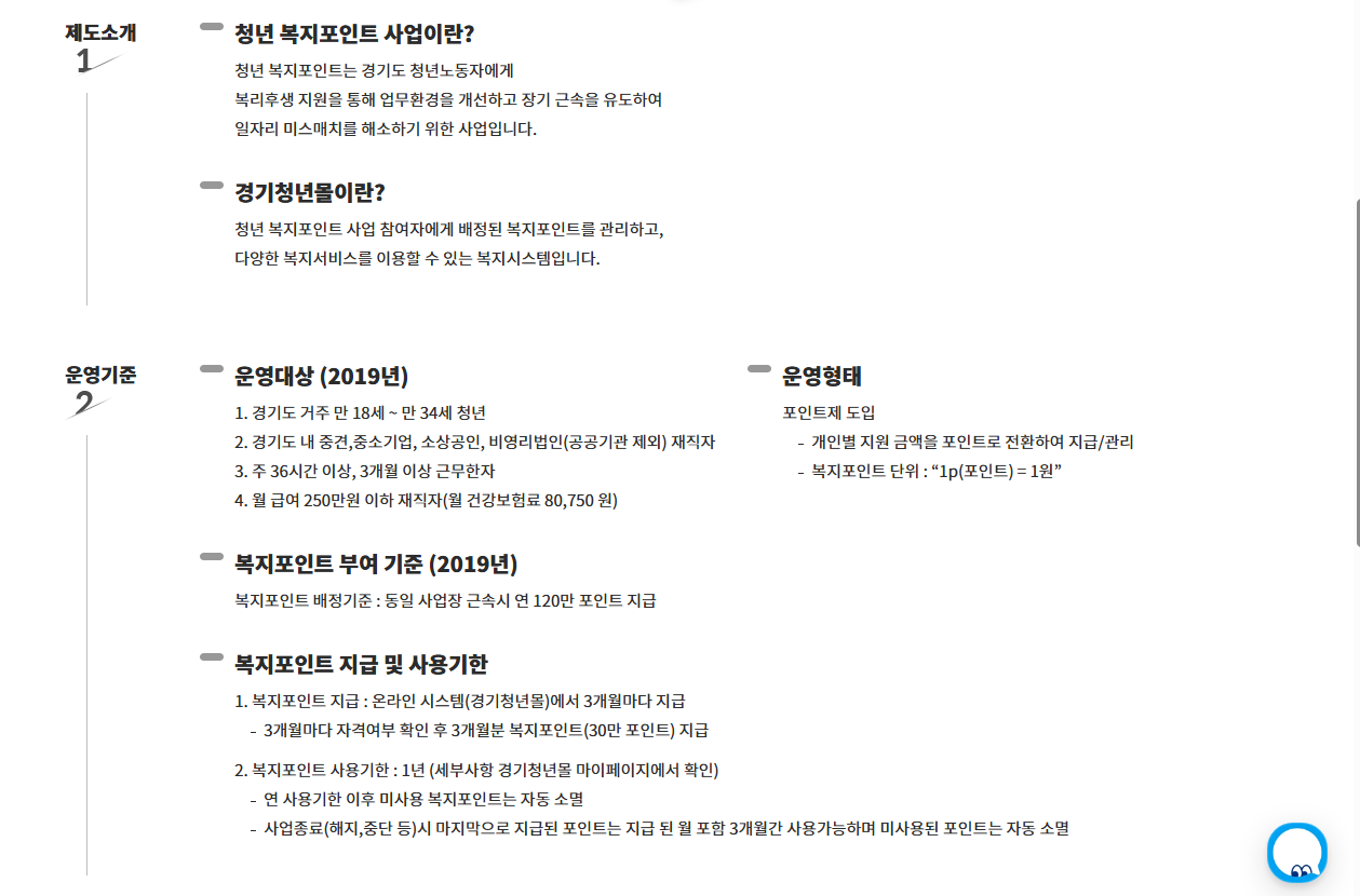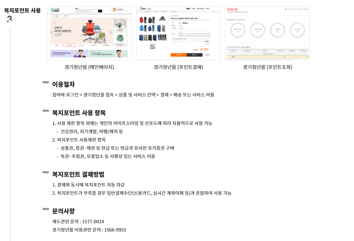 - 사용처 : 전용 온라인몰 ‘경기청년복지몰’에서 문화생활, 자기개발, 건강관리 등 다양한 상품 구매