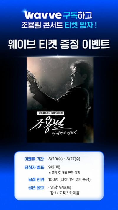 웨이브(Wavve)는 이번 콘서트 방송과 VOD OTT 독점 제공을 기념해 8월 20일 오후 2시 ~ 8월 27일까지 티켓 증정 이벤트를 진행합니다. 웨이브 구독자라면 누구나 앱·웹 이벤트 페이지에서 참여할 수 있으며, 9월 3일 추첨을 통해 총 100명(1인 2매)이 당첨됩니다.