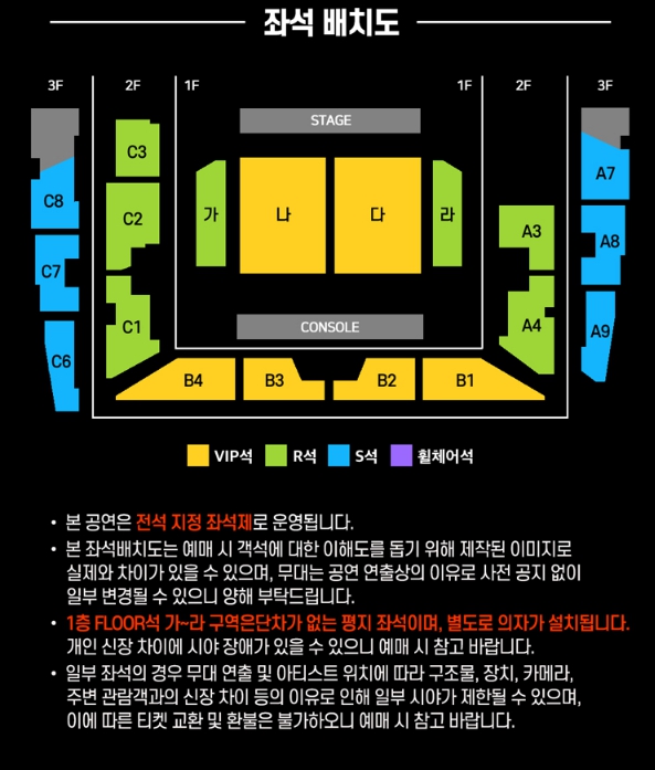 - 단, 일부 좌석은 무대 구조물이나 촬영장비로 인해 시야 제한 가능성 있음